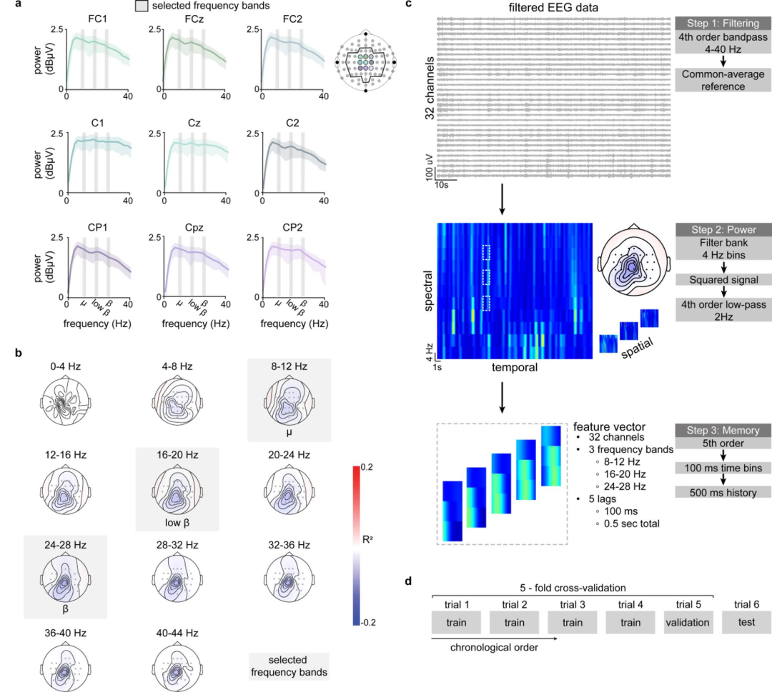 LDA分類器:使用480個(gè)特征(3頻帶 × 5時(shí)間窗 × 32通道)進(jìn)行二分類(運(yùn)動(dòng)/靜止),采用5折交叉驗(yàn)證訓(xùn)練(圖3c,d)。
