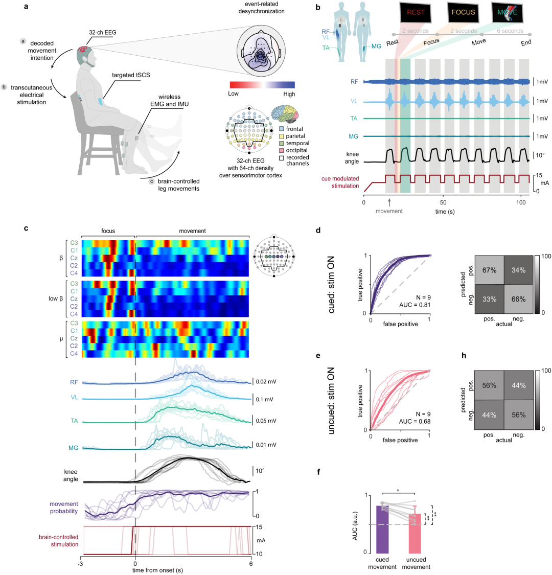 BSI系統(tǒng)通過(guò)EEG實(shí)時(shí)解碼大腦運(yùn)動(dòng)意圖(如膝關(guān)節(jié)伸展),并控制tSCS的輸出時(shí)機(jī),形成閉環(huán)系統(tǒng)。當(dāng)患者嘗試運(yùn)動(dòng)時(shí),EEG檢測(cè)到運(yùn)動(dòng)皮質(zhì)的“事件相關(guān)去同步化”(ERD),解碼器識(shí)別出運(yùn)動(dòng)起始信號(hào)后,觸發(fā)tSCS刺激脊髓,輔助完成運(yùn)動(dòng)。