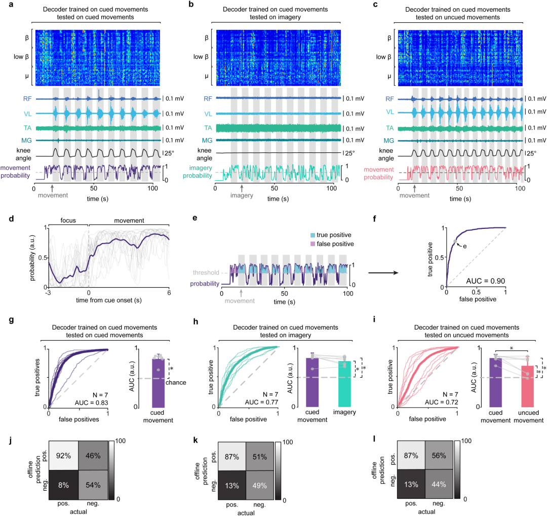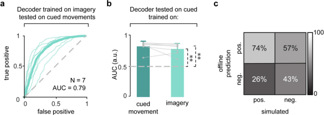 解碼器在實(shí)時(shí)任務(wù)中表現(xiàn)良好(AUC > 0.8),表明可實(shí)現(xiàn)“意圖驅(qū)動(dòng)”的刺激輸出。