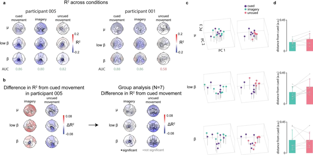 參與者:17名健康成人,進(jìn)行三類任務(wù):提示運(yùn)動(dòng)、運(yùn)動(dòng)想象、非提示運(yùn)動(dòng)(圖2b)。