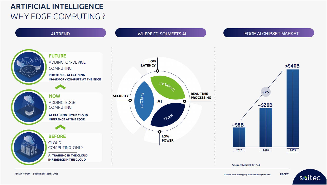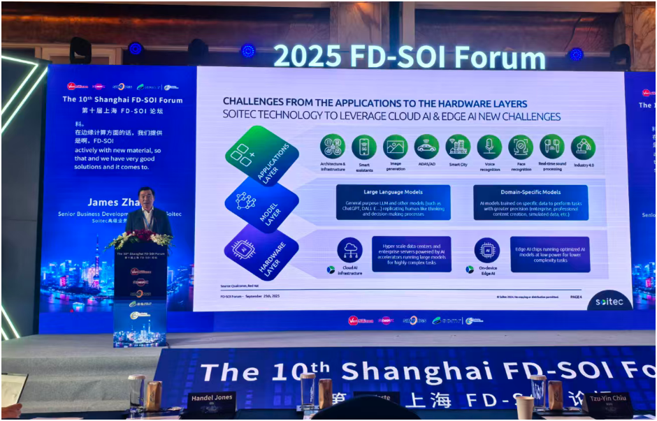 James Zhang指出,Soitec是FD-SOI最主要的材料供應商。之前大部分的AI都是在云端,延時會很高,現(xiàn)在推理大部分放在了邊緣端,以實現(xiàn)即時的AI能力,滿足低延時、低功耗的要求.。