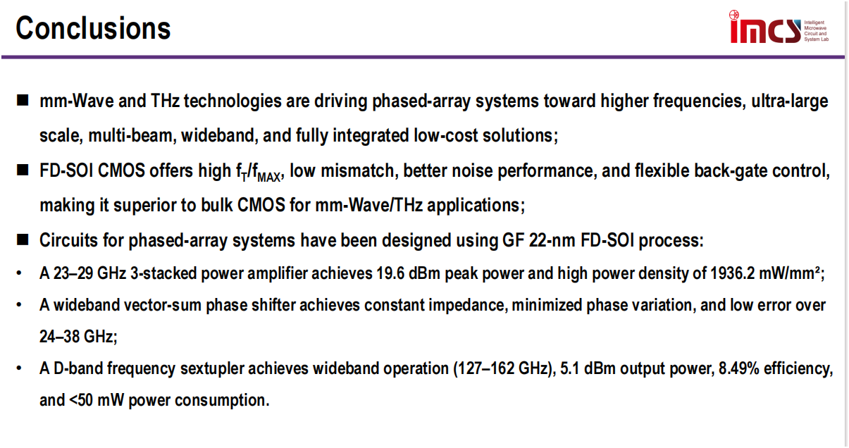 陳文華教授分享總結指出,毫米波(mm-Wave)和太赫茲(THz)技術正推動相控陣系統(tǒng)向更高頻率、超大規(guī)模、多波束、寬帶以及完全集成的低成本解決方案發(fā)展;FD-SOI CMOS 具有高 fT/fMAX、低失配、更好的噪聲性能以及靈活的背柵控制,使其在毫米波/太赫茲應用中優(yōu)于體硅 CMOS;已采用 GF 22 納米 FD-SOI 工藝設計了用于相控陣系統(tǒng)的電路。