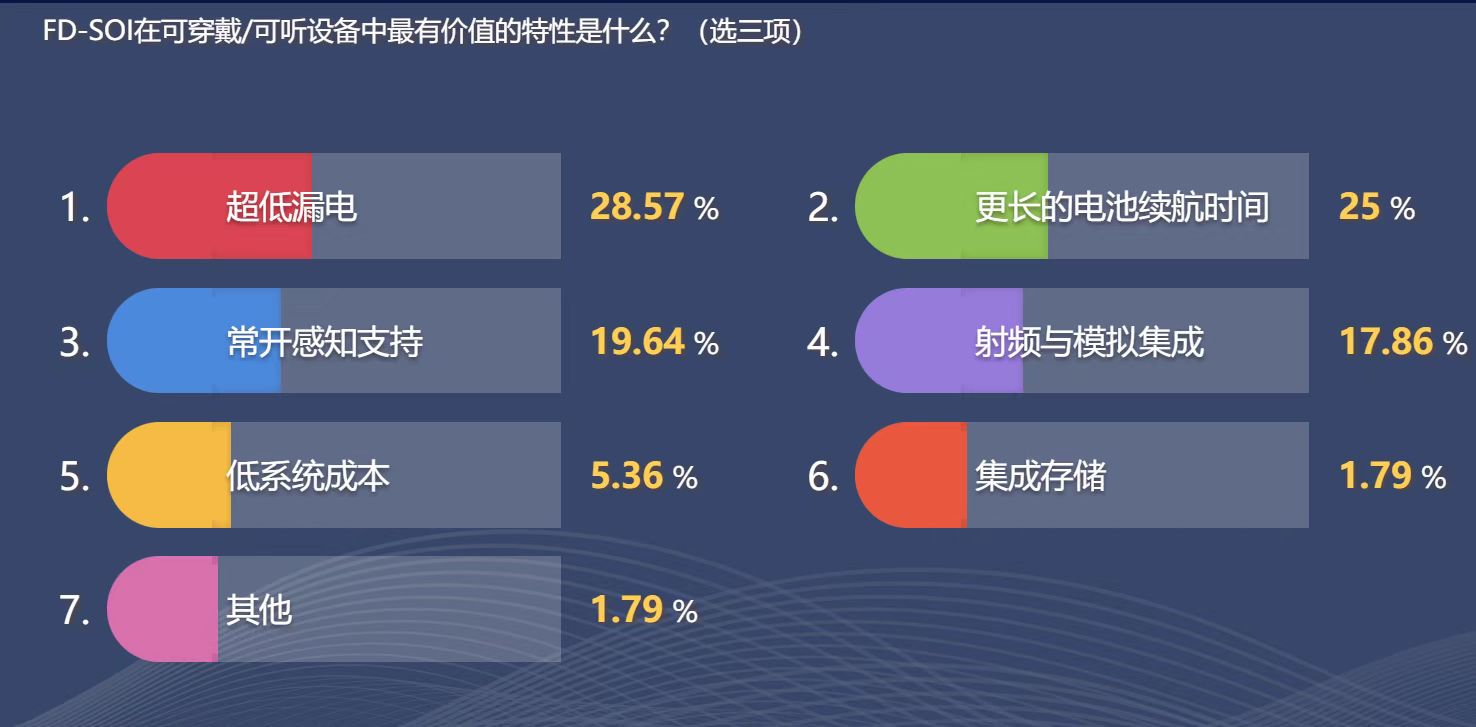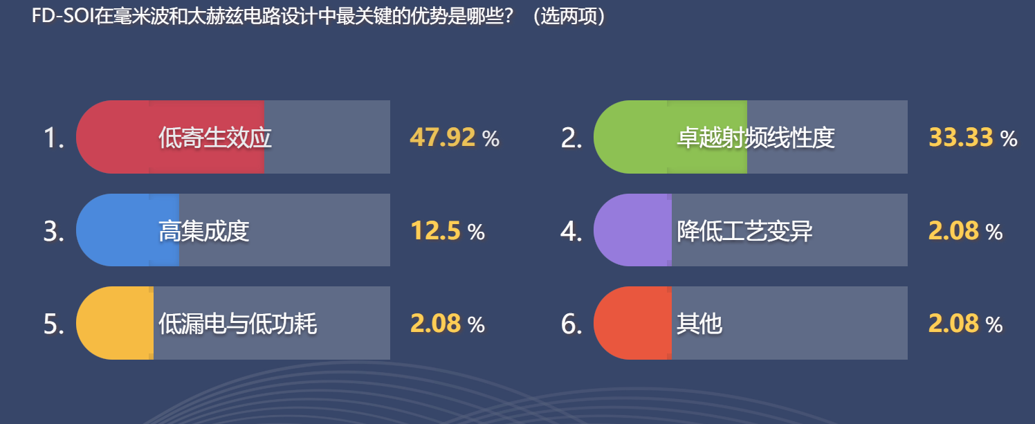 圓桌現(xiàn)場投票1:FD-SOI在毫米波和太赫茲電路設計中最關鍵的優(yōu)勢,前兩項排名分別是低寄生效應和卓越的射頻線性度。