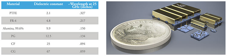 這些高 K 材料的優(yōu)勢(shì)效果非常顯著,如圖 2 對(duì)比所示:三種常見電介質(zhì)材料(PTFE、FR-4 和氧化鋁)以及 Knowles 開發(fā)的三種定制基板(PG、CF 和 CG)在 25 千兆赫 (GHz) 時(shí)的介電常數(shù)及對(duì)應(yīng)波長(zhǎng)。他們的 CF 基板的介電常數(shù)為 25,而 FR-4 材料的介電常數(shù)為 4.8。因此,采用 CF 材料制造的器件波長(zhǎng)縮短至 FR-4 材料器件的 2/5,實(shí)現(xiàn)了器件尺寸的大幅縮小。