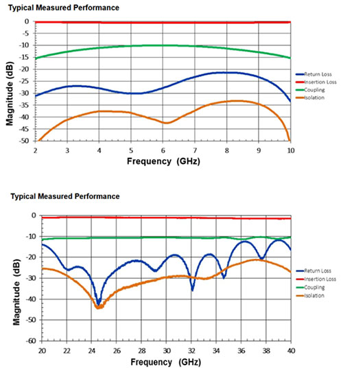 。101040010\\101040010K定向耦合器的插入損耗(包括耦合功率)小于1.3 dB(1-20 GHz)和小于2.0 dB(20-40 GHz),方向性大于14 dB(1至20 GHz