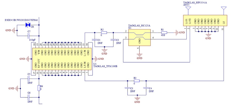 請(qǐng)注意,HC125A 混合耦合器僅適用于這款天線的高 GNSS 操作頻段(1,559 至 1,610 MHz)。評(píng)估板布局圖明確說(shuō)明了混合耦合器的安裝要求:緊鄰天線引腳布置,并通過(guò)并聯(lián)兩個(gè) 100 Ω 電阻實(shí)現(xiàn)正確端接。