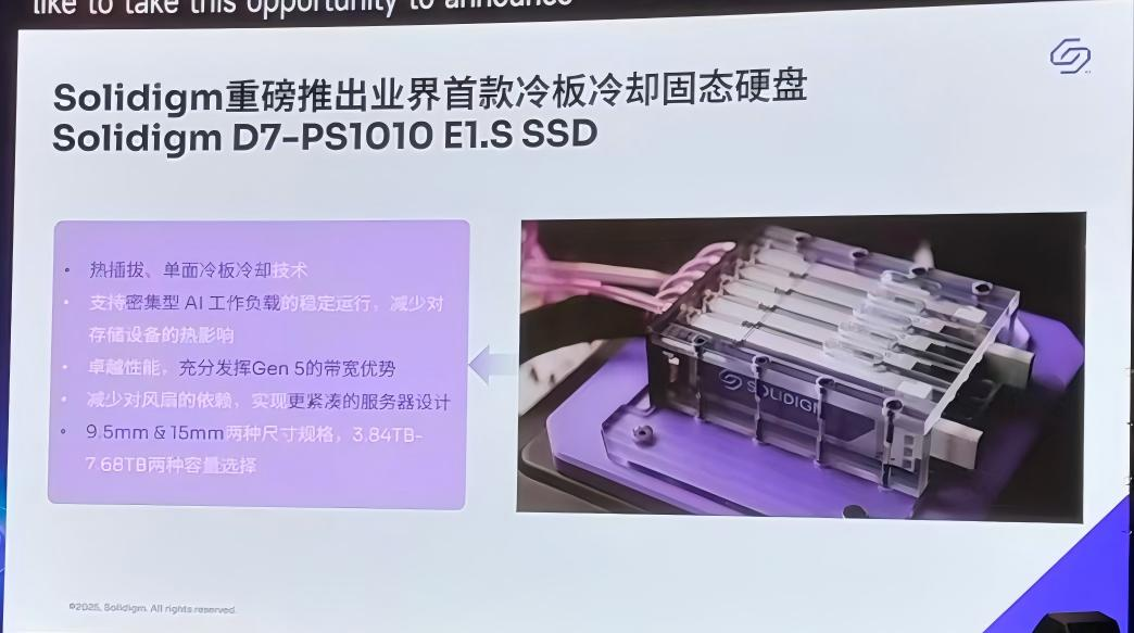 倪錦峰還重點(diǎn)介紹了Solidigm的幾款明星產(chǎn)品。D7-PS1010和PS1030固態(tài)硬盤采用領(lǐng)先的PCIe Gen 5性能設(shè)計(jì),為加速各種工作負(fù)載而優(yōu)化,特別適用于AI數(shù)據(jù)管道,性能提升最高可達(dá)50%。此外,Solidigm還推出了業(yè)界首款冷板冷卻固態(tài)硬盤D7-PS1010 E1.S SSD,采用熱插拔、單面冷板冷卻技術(shù),確保密集型AI工作負(fù)載的穩(wěn)定運(yùn)行。