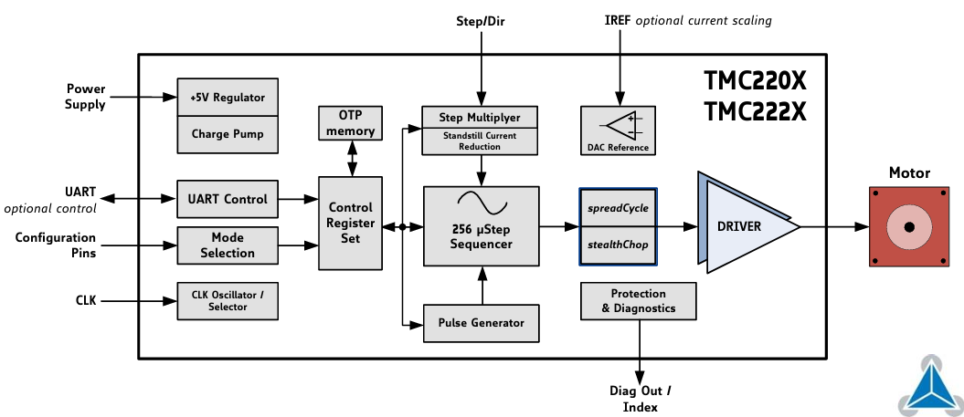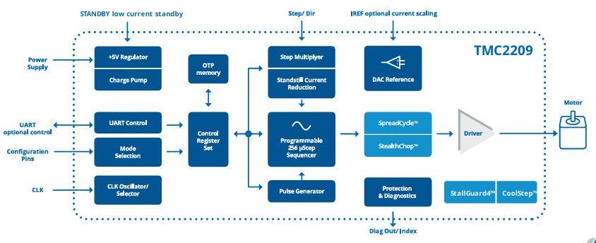 TMC2208和TMC2209驅(qū)動器擁有強大的 MOSFET,擅長管理巨大的電機電流,確保在不同負載下保持穩(wěn)定的性能。功能豐富的通用異步接收器-發(fā)射器 (UART) 接口可對電機功能進行詳細控制,輕松集成到復雜系統(tǒng)中并允許根據(jù)特定需求進行調(diào)整。這種適應性對于現(xiàn)成設置不足的定制應用來說非常寶貴。配置可以存儲在一次性可編程 (OTP) 存儲器中,突出了這些驅(qū)動程序滿足持久和多樣化作要求的能力。TMC2208和TMC2209驅(qū)動器在保持高精度的同時,在降噪方面表現(xiàn)出色。這與人們對人體工程學和有利于創(chuàng)造力和生產(chǎn)力的環(huán)境的日益重視相一致。