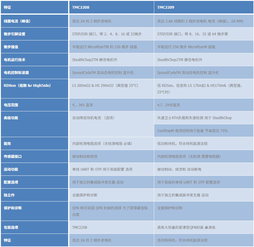 TMC2209功能框圖 TMC22xx 系列在功率密度、集成功率 MOSFET、平穩(wěn)安靜的運行以及友好的簡單性方面得分。TMC22xx 涵蓋從電池系統(tǒng)到嵌入式應用的廣泛應用,每個線圈的電機電流高達 2 A。創(chuàng)邁獨特的斬波器模式 SpreadCycle 和 StealthChop2 優(yōu)化了驅(qū)動器性能。StealthChop 將電機噪音降低到低速時的靜音點。待機電流降低可降低功耗和冷卻成本。廣泛的支持可實現(xiàn)快速設計周期和快速上市,并推出具有競爭力的產(chǎn)品。