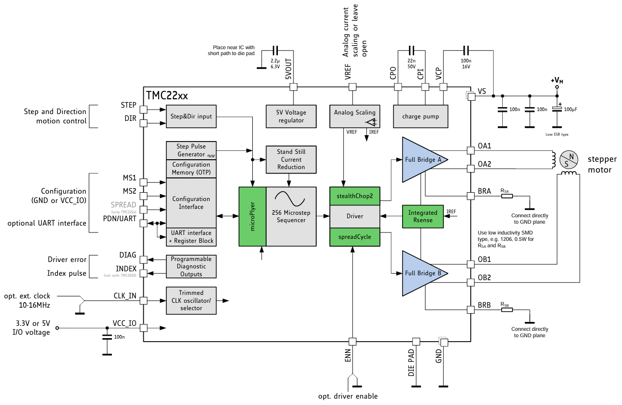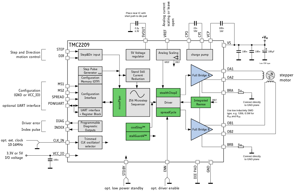 TMC2209應用電路 TMC22xx 系列步進驅(qū)動器旨在作為現(xiàn)有低成本步進驅(qū)動器應用的直接升級。其靜音驅(qū)動技術(shù) StealthChop 可為家庭和辦公室應用實現(xiàn)無竊聽運動控制。高效的功率級可從微型封裝實現(xiàn)高電流。