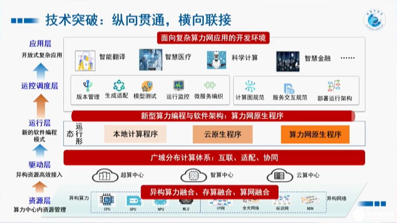 “從通信層、計(jì)算層、網(wǎng)絡(luò)層和應(yīng)用層形成全棧式的關(guān)鍵挑戰(zhàn),算力網(wǎng)的四大技術(shù)大山分別是:一、大型自主算力供給與應(yīng)用,比如從千卡走向萬卡,從萬卡走向十萬卡,十萬卡集群以華為384超節(jié)點(diǎn)Atlas 900 A3 SuperProD為代表,在上面能否訓(xùn)練大模型方向的智能化服務(wù);二、芯光纖通信與網(wǎng)絡(luò)傳輸,即算力從局域網(wǎng)到廣域,芯片互聯(lián)集群走向IDC之間的互聯(lián),大型的傳輸如何解決;三、協(xié)同調(diào)度和算力協(xié)同標(biāo)準(zhǔn),不同的算力中心使用不同的芯片,彼此之間有不同的異構(gòu),中間的計(jì)算層的互聯(lián)適配非常難;四、安全可信的計(jì)算環(huán)境。” 余躍分析說。