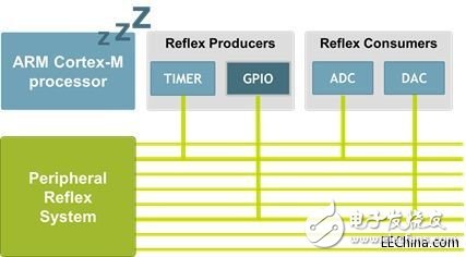 圖2:通過使能MCU外設(shè)自治運行并且保持處理器內(nèi)核處于休眠狀態(tài),外設(shè)反射系統(tǒng)節(jié)省系統(tǒng)能耗