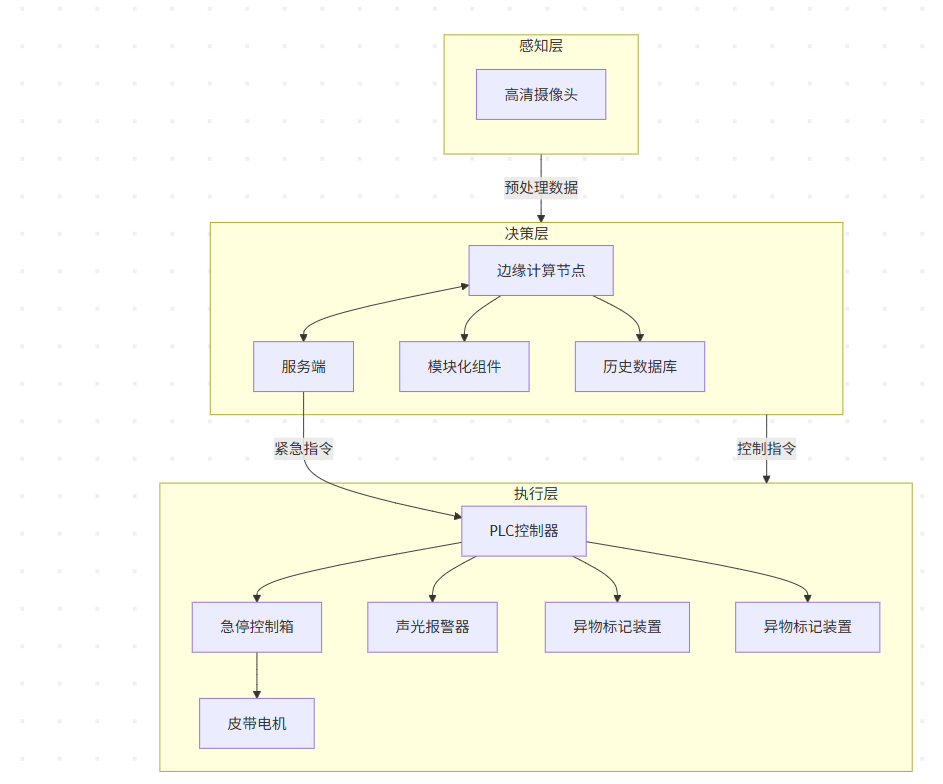 決策層: 采用邊緣計(jì)算、模塊化部署、服務(wù)端協(xié)同計(jì)算架構(gòu)。邊緣側(cè)部署輕量化推理模型,實(shí)現(xiàn)毫秒級實(shí)時(shí)響應(yīng),采用模塊化部署,各模板獨(dú)立運(yùn)行,且與皮帶控制系統(tǒng)PLC直接連接,第一時(shí)間聯(lián)動PLC系統(tǒng);服務(wù)端建立深度神經(jīng)網(wǎng)絡(luò)模型,通過持續(xù)學(xué)習(xí)機(jī)制提升識別準(zhǔn)確率。系統(tǒng)支持動態(tài)閾值調(diào)整,可根據(jù)物料類型(礦石/煤炭/糧食)、環(huán)境條件(白天/夜晚/雨霧)優(yōu)化檢測參數(shù)。