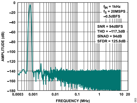 在實際測試中,AD4081展現(xiàn)出了令人印象深刻的性能表現(xiàn)。在1kHz輸入頻率下,SNR達到94dB,THD為-117.3dB;即使在1MHz的高頻輸入下,仍能保持93.7dB的SNR和-103.7dB的THD。