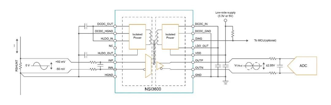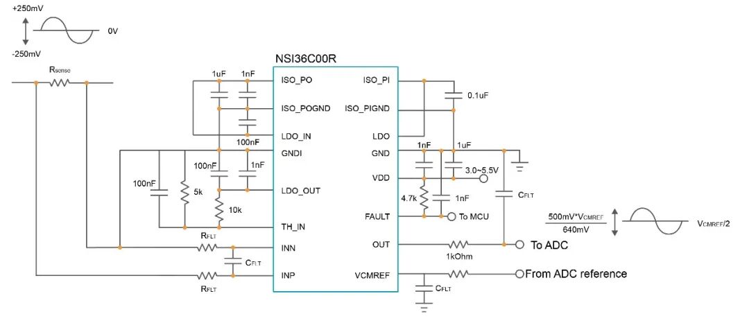 簡化供電設(shè)計:傳統(tǒng)的隔離采樣方案需要為高壓側(cè)和低壓側(cè)分別供電,而NSI36xx系列只需在低壓側(cè)提供單一電源即可正常工作,省去了復(fù)雜的高壓側(cè)供電電路。這不僅減少了電源設(shè)計復(fù)雜度,還顯著縮短了開發(fā)周期。