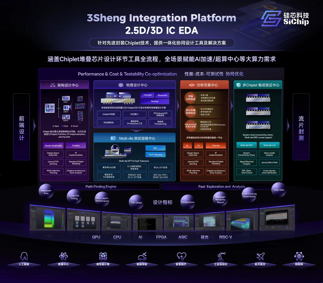 基于以上算力芯片堆疊的發(fā)展趨勢,珠海硅芯科技專注于2.5D/3D堆疊芯片EDA工具研發(fā)及產業(yè)化。公司自主研發(fā)的3Sheng Integration Platform平臺涵蓋物理設計、分析仿真和測試容錯三大板塊,包含3ShengZenith架構設計中心、3ShengRanger物理設計中心、3ShengOcean測試容錯中心、3ShengVolcano分析仿真中心、3ShengStratify集成驗證中心五大技術模塊,提供從系統(tǒng)級建模到芯片集成驗證的全流程工具鏈,填補國內2.5D/3D芯片設計關鍵技術空白。