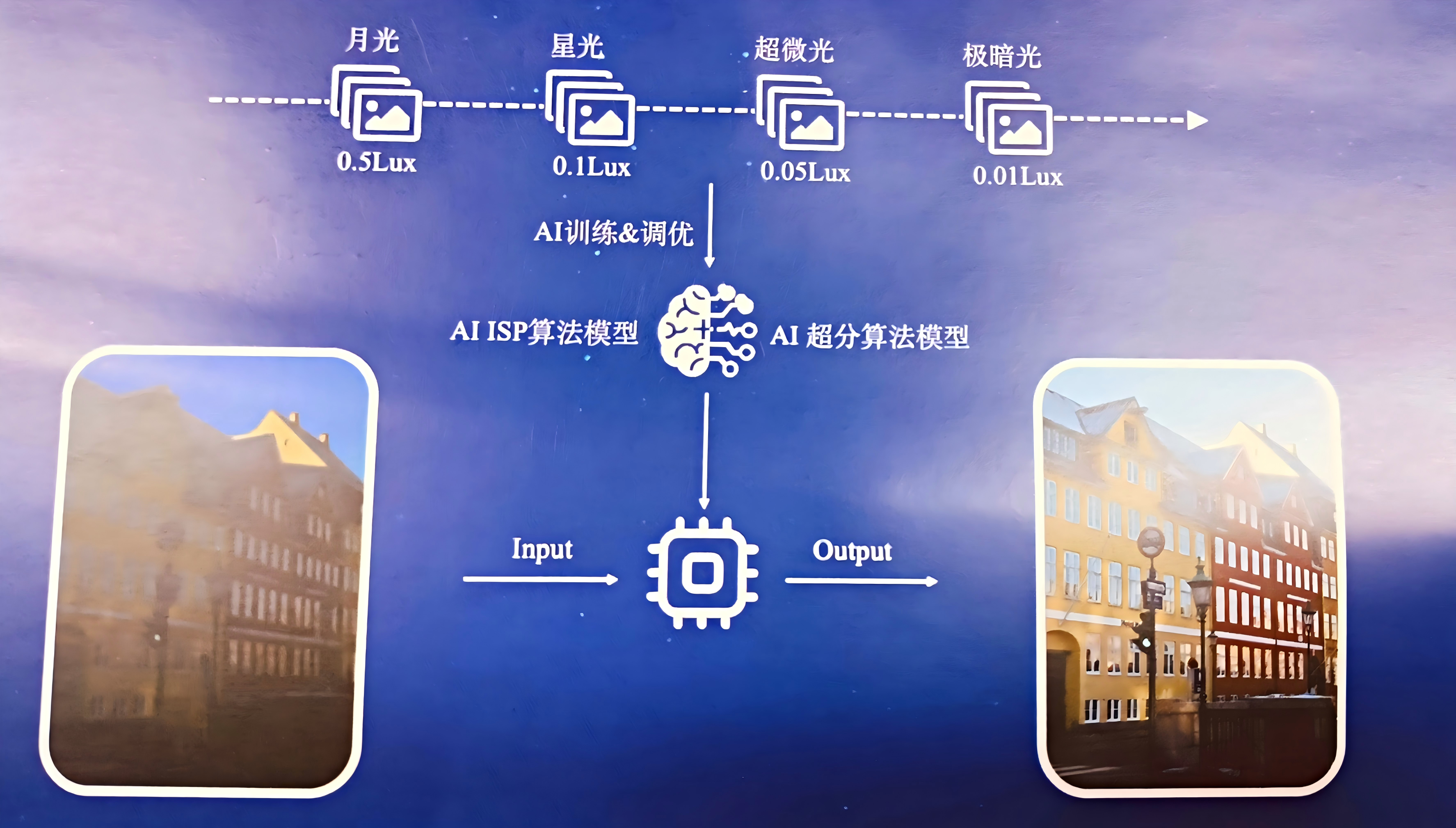 夜幕降臨,光影與夜色交織,一束束燈光將黑夜裝扮得流光溢彩。然而,傳統(tǒng)鏡頭下的夜色常常因看不清、黑白色、需補等問題而留下遺憾。AI ISP的出現(xiàn)為黑夜“補充”白光,讓傳統(tǒng)鏡頭不再“遺憾”。
