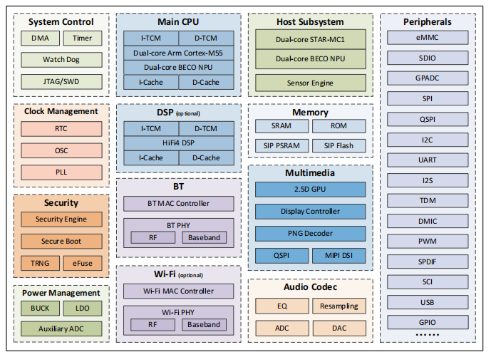 BES2800系列芯片整體特性之一是低功耗與高性能并存。該系列芯片采用先進(jìn)的制程工藝(如6nmFinFET),在單芯片上集成了多核CPU/GPU、NPU、大容量存儲、低功耗Wi-Fi和雙模藍(lán)牙等關(guān)鍵組件。這種高度集成的設(shè)計顯著降低了功耗,同時提供了強(qiáng)大的應(yīng)用處理能力。具體而言,該系列芯片搭載了雙核ArmCortex-M55處理器與雙核BECONPU神經(jīng)網(wǎng)絡(luò)加速器,以及可選配的TensilicaHiFi4DSP音頻處理器,確保了高效的數(shù)據(jù)處理和低延遲的音頻傳輸。