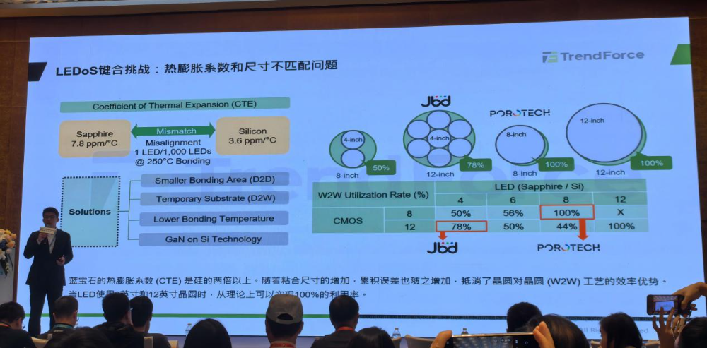 在廠商方案的選擇上也有所差異,例如英國Porotech公司投資開發(fā)8英寸硅基GaN平臺(tái),實(shí)現(xiàn)與8英寸CMOS的100%鍵合利用率;而國內(nèi)的JBD則通過將12英寸晶圓切割為7塊4英寸區(qū)域,實(shí)現(xiàn)約80%的利用率,具備一定的產(chǎn)業(yè)化可行性。目前無論從材料層面還是尺寸匹配度上都有相應(yīng)的解決方案,只是行業(yè)內(nèi)還未形成共識(shí)。
