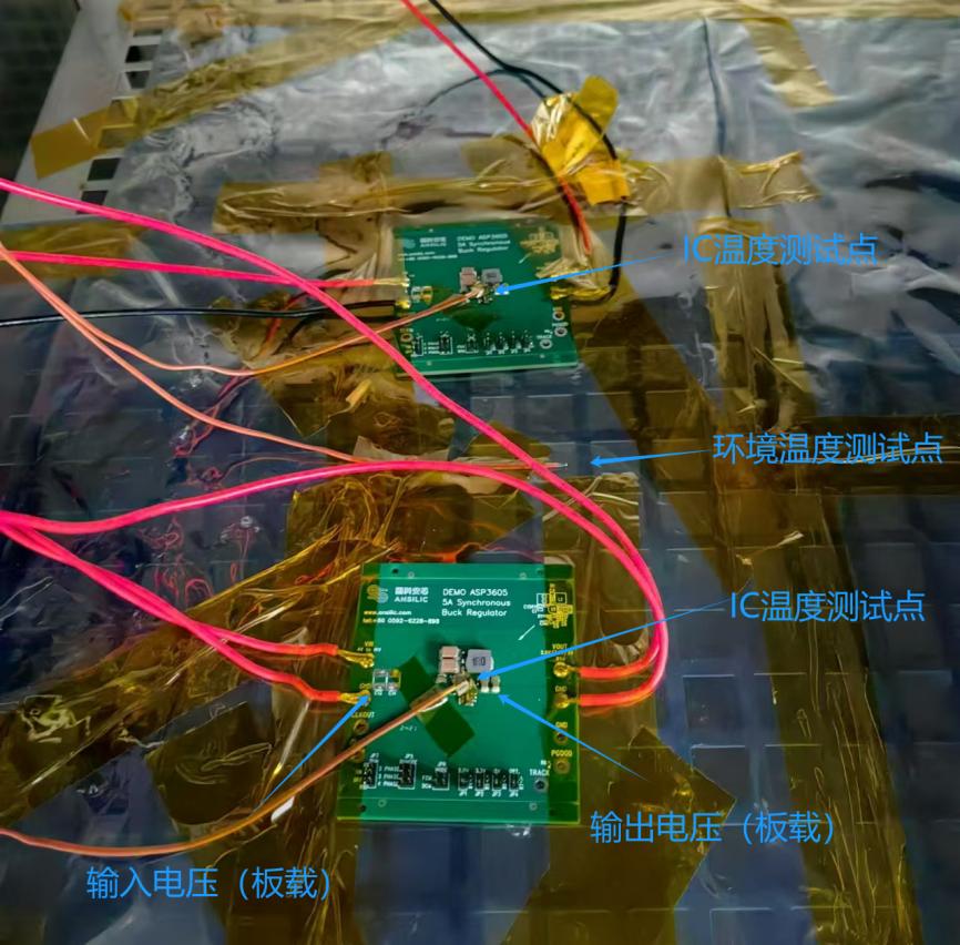 測(cè)試在可程式恒溫恒濕箱中進(jìn)行,溫度控制精度±2℃,箱內(nèi)氣流速度≤0.5m/s以模擬自然對(duì)流。芯片表面溫度通過K型熱電偶直接粘貼于封裝頂部測(cè)量,響應(yīng)時(shí)間<0.5s。測(cè)試板通過硅橡膠線纜引出至箱外儀器,線纜電阻約50mΩ,在1A電流下引入5mV壓降,測(cè)量結(jié)果已作補(bǔ)償修正。