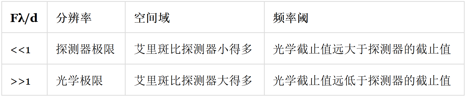 理解這兩種極限情況非常重要(見表 1)。例如,在探測器受限區(qū)域工作時(shí),改變孔徑直徑并不會(huì)顯著影響分辨率。相反,在光學(xué)受限區(qū)域工作時(shí),改變探測器尺寸的影響微乎其微。從探測器受限狀態(tài)到光學(xué)受限狀態(tài)的轉(zhuǎn)變是漸進(jìn)的,其范圍大致在 0.41 < Fλ/d < 1.0 之間。