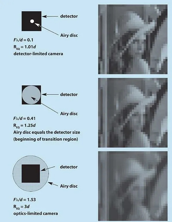隨著 Fλ/d 的值減小,REQ 接近光限制操作下的 d(即 d = 光學(xué)限制操作下的探測器尺寸)。對于較大的 Fλ/d 值,系統(tǒng)會(huì)受到光學(xué)限制,等效分辨率也會(huì)隨之增加。將艾里斑(d = 2.44 Fλ)與探測器尺寸相匹配,會(huì)得到一個(gè)比實(shí)際探測器尺寸大 25% 的等效分辨率(圖 2)。與光限制下的圖像相比,此圖像略顯模糊,但對于某些應(yīng)用來說可能是可以接受的。在光學(xué)限制區(qū)域,與光限制下的圖像相比,圖像肯定顯得模糊。