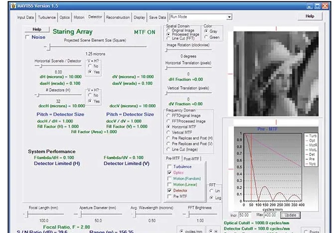 同樣重要但通過一般圖像難以察覺的是采樣偽影。邊緣模糊和相位效應(yīng)在《探測器陣列:馴服不規(guī)則形狀問題》一文中有所描述。通過周期性圖案(如美國空軍 1951 年靶標(biāo)和條形碼)可以增強(qiáng)采樣效應(yīng)。MAVIISS 能夠模擬從低填充因子到由超分辨率算法生成的任何輸入場景的各類成像系統(tǒng)。其功能豐富的圖形用戶界面(圖 6)使用戶能夠輕松且快速地在系統(tǒng)設(shè)計(jì)的權(quán)衡空間中進(jìn)行操作。重要參數(shù)的值通過滑塊進(jìn)行控制。由于其快速執(zhí)行速度,MAVIISS 在重要參數(shù)變化時(shí)能夠提供近乎流暢的圖像變化。