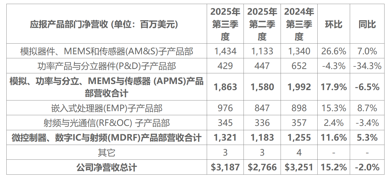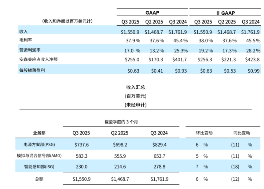 11月3日,安森美發(fā)布2025年會計年度第三季度(截止10月3日)財報,營收達到15.509億美元,雖較去年同期 17.6 億美元下滑,但仍優(yōu)于市場估計的 15.2 億美元。超出市場預期。主要來源于人工智能 (AI) 應用蓬勃推動數(shù)據(jù)中心對節(jié)能電源管理芯片需求強勁,抵銷汽車市場疲弱影響。