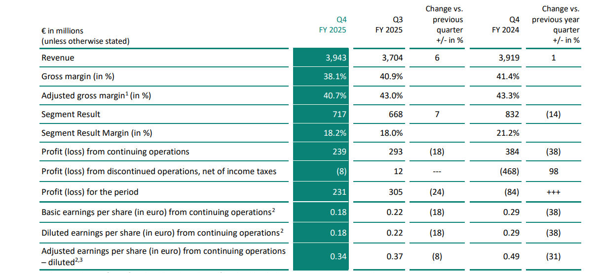 分業(yè)務來看,2025 財年第四季度,英飛凌汽車業(yè)務板塊營收從上個季度的 18.70 億歐元增至 19.21 億歐元,增幅達 3%。營收增長主要得益于智能功率器件、微控制器及電動汽車解決方案領(lǐng)域收入的提升,其中電動汽車解決方案業(yè)務受益于美國和中國補貼到期前的預防性采購需求。汽車業(yè)務板塊的利潤從上個季度的 3.71 億歐元改善至本季度的 4.30 億歐元;部門利潤率(Segment Result Margin)也從第三季度的 19.8% 上升至第四季度的 22.4%。