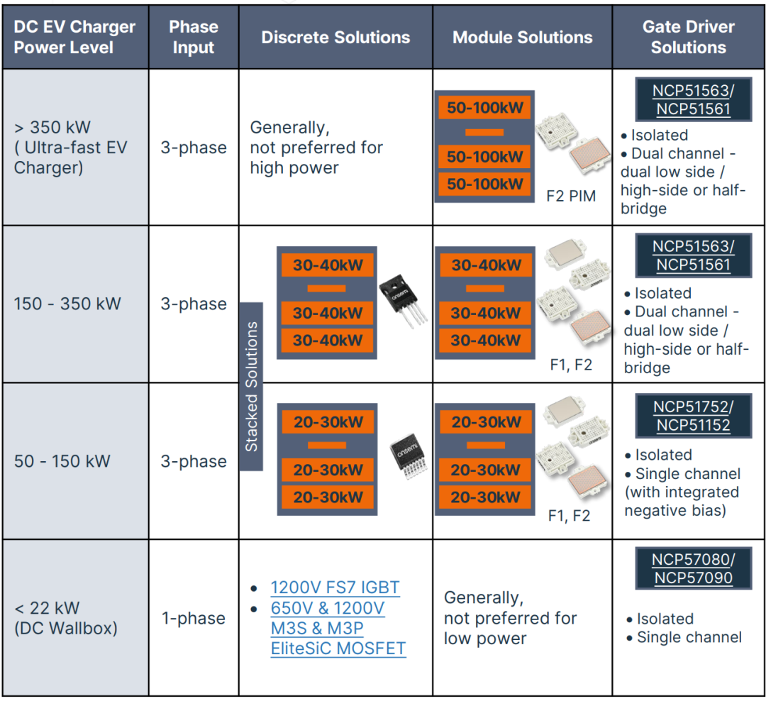 作為功率半導(dǎo)體行業(yè)的領(lǐng)軍企業(yè), 安森美針對直流快充(DCFC) 應(yīng)用提供定制化解決方案, 并針對各種功率等級提供了全面的建議。 從功率低于22 kW的直流壁掛式充電系統(tǒng), 到功率超過350 kW的超快速電動汽車充電系統(tǒng), 安森美的EliteSiC MOSFET和Field Stop 7 IGBT可實現(xiàn)更高效率與功率密度, 同時搭配隔離柵極驅(qū)動器, 顯著提升系統(tǒng)安全性與可靠性。