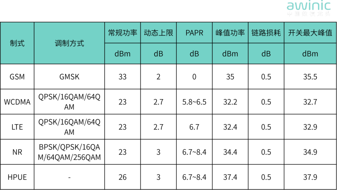 耐受功率是表征射頻開關(guān)能承受多大輸入功率而不損壞的指標(biāo)。該指標(biāo)對TX鏈路上的射頻開關(guān)來說非常重要。圖6列出了在不同通信制式下對射頻開關(guān)耐受功率的要求。