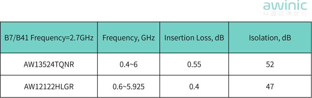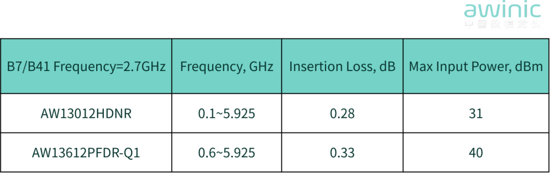 艾為電子的RX射頻開關(guān)AW13012HDNR的插入損耗性能業(yè)內(nèi)領(lǐng)先,在B7/B41頻段僅為0.28dB,在N79頻段僅為0.4dB。極低的插入損耗有效地提升了信噪比。TRX射頻開關(guān)AW13612PFDR-Q1更是通過了AEC-Q100(車規(guī)標(biāo)準(zhǔn))認(rèn)證,該產(chǎn)品在B7/B41頻段僅有0.33dB插入損耗且具有高達(dá)40dBm的耐受功率。圖2列出了這兩顆射頻開關(guān)的部分指標(biāo)。
