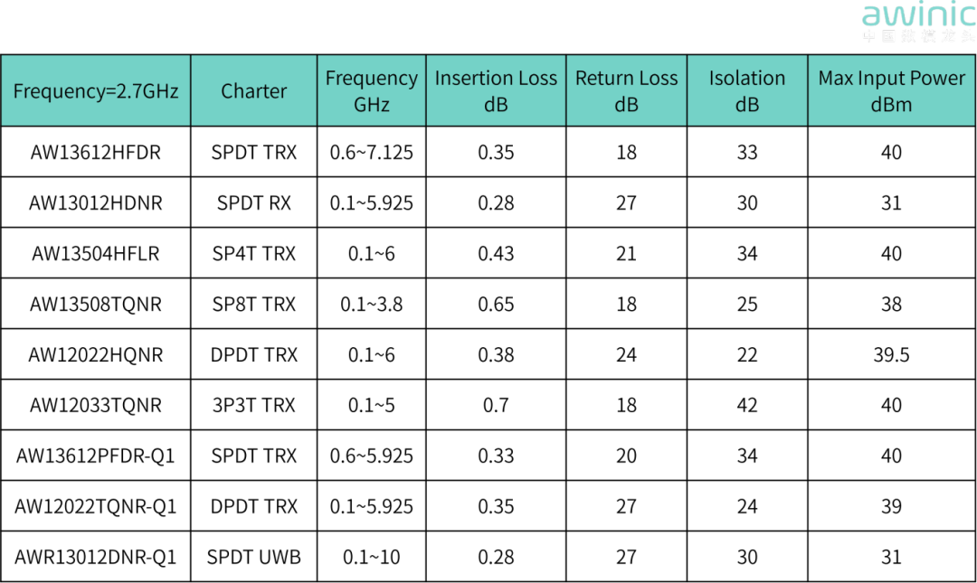 低插入損耗型射頻開關(guān)AW12022TQNR-Q1在2.3GHz~2.7GHz的插入損耗僅為0.35dB,并且通過了AEC-Q100(車規(guī)標(biāo)準(zhǔn))認(rèn)證,可供高可靠性需求的客戶選用。