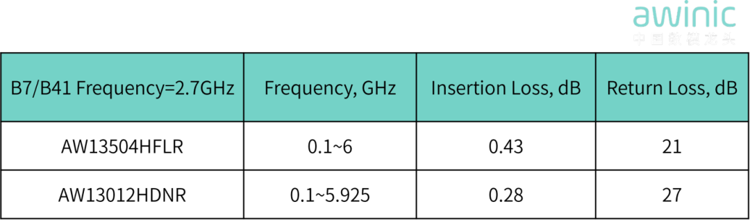 艾為電子的SP4T射頻開關(guān)AW13504HFLR在B7/B41頻段的回波損耗為20dB;SPDT射頻開關(guān)AW13012HDNR在B7/B41頻段的回波損耗為27dB,在N79頻段也可以達(dá)到20dB以上。這種水平的回波損耗不會成為系統(tǒng)設(shè)計的瓶頸。
