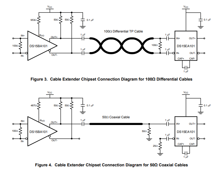 與DS15BA101組成的電纜擴(kuò)展芯片組,在不同類型電纜的應(yīng)用中,設(shè)置正確的DS15BA101輸出幅度和適當(dāng)?shù)碾娎|端接是實(shí)現(xiàn)最佳性能的關(guān)鍵。同時(shí),TI還提供了完整的參考設(shè)計(jì)(P/N: DriveCable02EVK)供工程師進(jìn)行評(píng)估。