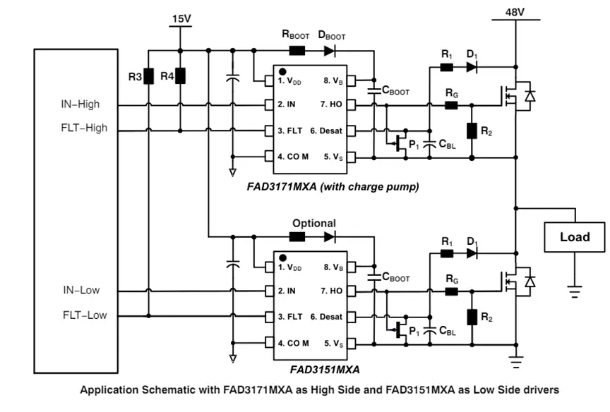 FAD3151MXA 和 FAD3171MXA 專為驅(qū)動高達 110 V 的高速功率 MOSFET 而設(shè)計,采用 SOI 技術(shù),能有效抵御高達 -80 V 的嚴重負瞬變和接地偏移,具有出色的抗噪聲能力。這兩款驅(qū)動器集成了去飽和檢測功能,可在短路和過流情況下保護功率開關(guān),還具備軟關(guān)斷特性,能防止重載條件下功率 MOSFET 出現(xiàn)過壓現(xiàn)象。此外,它們配備了雙向故障報告引腳,可在去飽和和欠壓鎖定(UVLO)時生成故障輸出,并能響應(yīng)外部故障命令,方便系統(tǒng)進行故障通信。其中,F(xiàn)AD3171MXA 還集成了電荷泵,支持高端 MOSFET 的 100% 占空比運行。