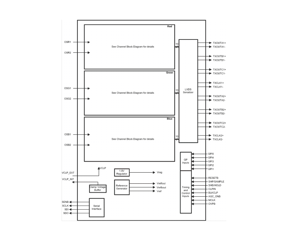 - LVDS 數(shù)據(jù)輸出:AFE 數(shù)據(jù)通過串行化的 LVDS 接口輸出,有多種串行化模式可供選擇,如 6 對(duì)模式可使用標(biāo)準(zhǔn)的 DS90CR218A 或 DS90CR364 解串器 IC,5 對(duì)模式可使用單個(gè) 5 通道解串器,可通過斷開未使用的數(shù)據(jù)對(duì)和 TXCLK 對(duì)來降低功耗和成本。