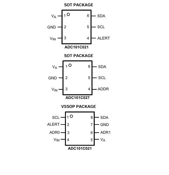 • 多地址選擇:VSSOP - 8封裝的ADC101C021提供多達(dá)九個(gè)引腳可選的芯片地址,而ADC101C027的SOT - 6封裝也有三個(gè)引腳可選地址,方便在同一I2C總線上連接多個(gè)設(shè)備。