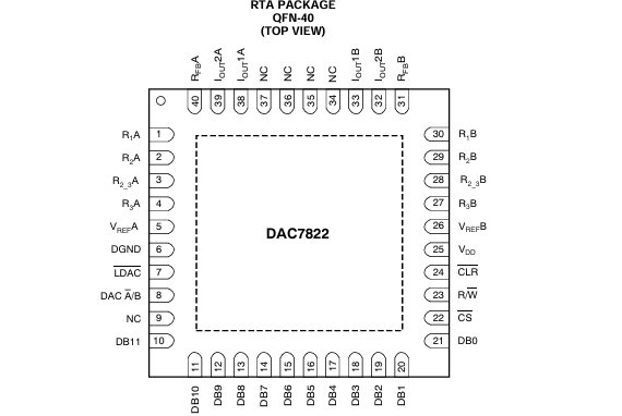 DAC7822的引腳功能豐富多樣,每個引腳都有其特定的作用。例如,RxA、R2sA、RgA等引腳為DAC A的四象限電阻引腳,可實現(xiàn)多種配置模式;VREFA和VREFB為DAC參考電壓輸入端子;LDAC引腳用于控制DAC輸出的更新等。