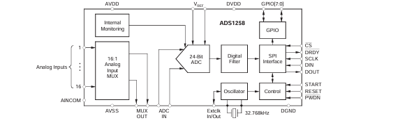 The ADS1258 is a 16-channel (multiplexed), low-noise, 24-bit, delta-sigma () analog-to-digital