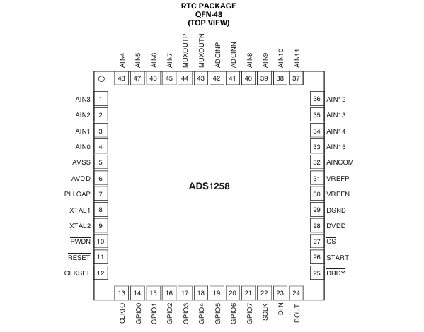 • 硬件引腳:START、DRDY、RESET和PWDN引腳可以直接控制ADS1258,也可以通過SPI接口使用相應的命令進行控制。PWDN引腳可將ADC置于低功耗狀態(tài)。