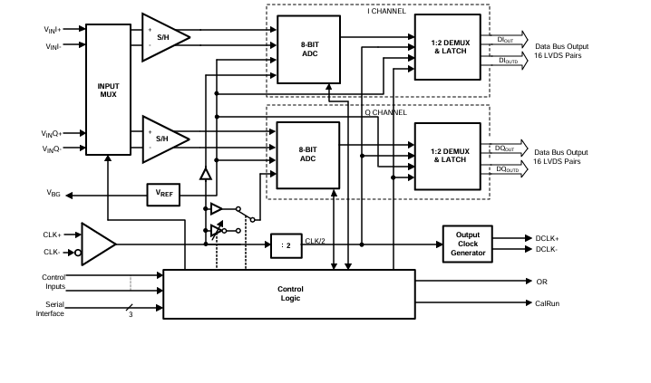 模擬輸入信號在轉(zhuǎn)換器輸入電壓范圍內(nèi)可被數(shù)字化為8位,采樣速度典型為200 MSPS至1.7 GSPS。當(dāng)差分輸入電壓低于負(fù)滿量程時,輸出字全為零;高于正滿量程時,輸出字全為一。任一通道出現(xiàn)這些情況都會激活超出范圍(OR)輸出。每個轉(zhuǎn)換器都有1:2解復(fù)用器,將數(shù)據(jù)輸出到兩個LVDS總線,用戶需對這些數(shù)據(jù)進(jìn)行交織以獲得完整轉(zhuǎn)換速率的輸出字。輸出電平可選擇正?;蚪档?,降低電平可節(jié)省功耗,但可能影響數(shù)據(jù)捕獲。