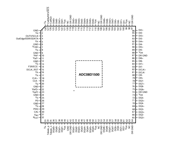 ADC08D1500經(jīng)過交流測試,動態(tài)性能有明確規(guī)定。為滿足規(guī)格要求并避免抖動噪聲,驅(qū)動CLK輸入的時鐘源應(yīng)具有低均方根抖動。輸入時鐘線應(yīng)盡量短,遠(yuǎn)離其他信號,并按傳輸線處理。將器件背面暴露焊盤良好接地可獲得最佳動態(tài)性能。