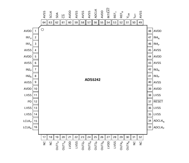 高速混合信號對各種噪聲耦合非常敏感,ADS5242采取了一系列措施來減少噪聲耦合。例如,明確劃分芯片的模擬和數字域,使用AVDD/AVSS表示模擬部分的電源和地,LVDD/LVSS表示數字部分的電源和地。同時,使用多個引腳驅動每個電源和地,以減小電源/地引腳的有效電感,從而更好地抑制噪聲。