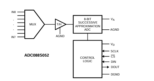 The ADC088S052 is a low-power, eight-channel CMOS 8-bitanalog-to-digital converter specified