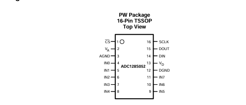The ADC128S052 is a low-power, eight-channel CMOS 12-bit analog-to-digital converter specified