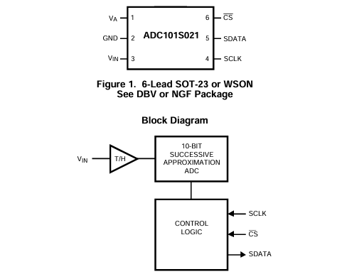 The ADC101S021 is a low-power, single channel CMOS 10-bit analog-to-digital converter with a