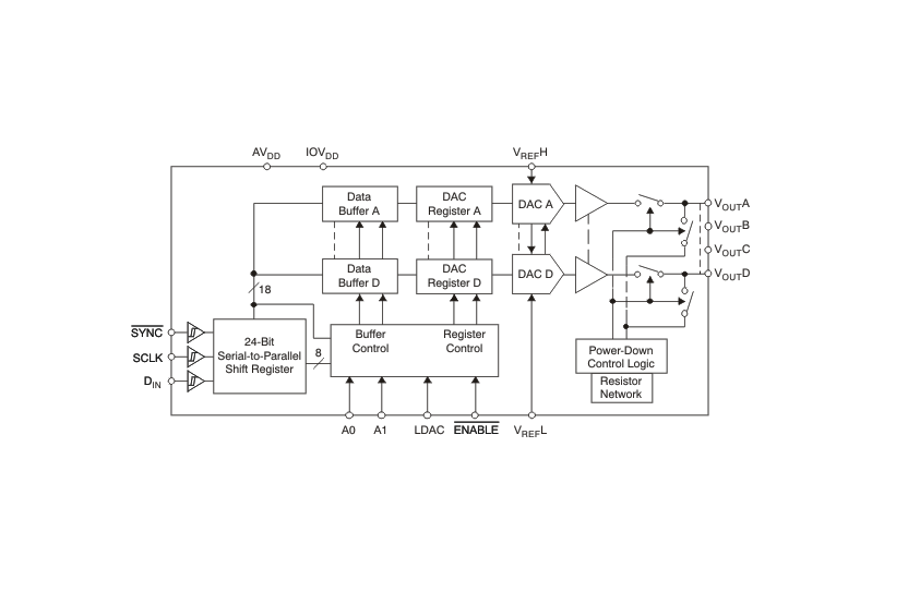 DAC8554的每個通道采用電阻串DAC架構(gòu),通過一個電阻串和一個輸出緩沖放大器實現(xiàn)模擬電壓輸出。電阻串部分根據(jù)加載到DAC寄存器的代碼選擇電壓節(jié)點,然后通過開關(guān)將該電壓應用到輸出放大器。輸出放大器能夠產(chǎn)生接近軌到軌的電壓輸出,其輸出范圍可達到0V至AVDD(需考慮增益和偏移誤差),并且能夠驅(qū)動2kΩ與1000pF并聯(lián)的負載。