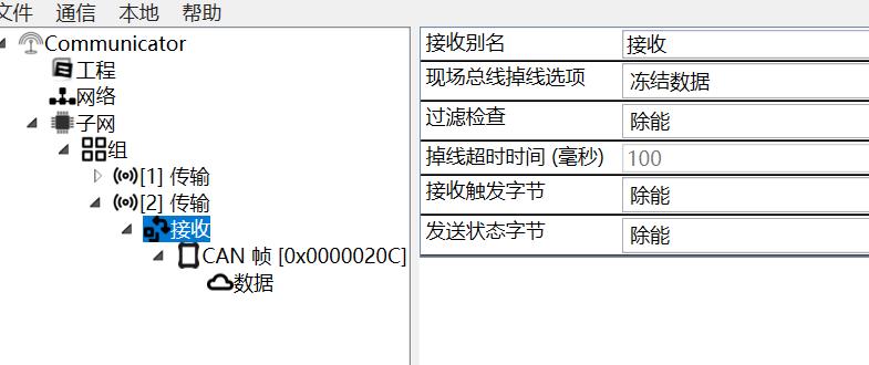 18)持續(xù)添加接收功能,針對(duì)現(xiàn)場(chǎng)掉線情況,選擇啟用凍結(jié)機(jī)制,并將掉線時(shí)間設(shè)定為100(單位需結(jié)合具體情境補(bǔ)充,此處原文未提及)。