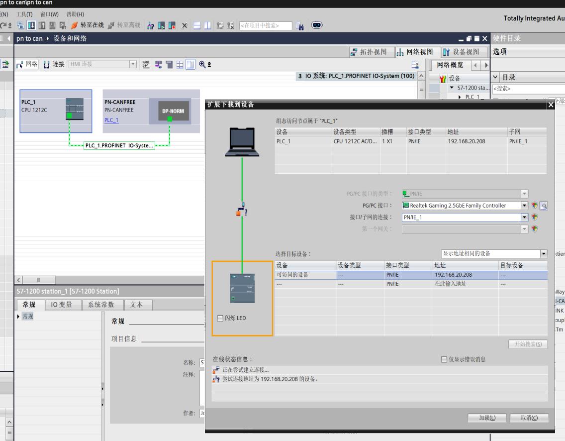 21)點(diǎn)擊通信模塊中的下載選項(xiàng),將Profinet轉(zhuǎn)Can網(wǎng)關(guān)配置文件下載至硬件設(shè)備中。